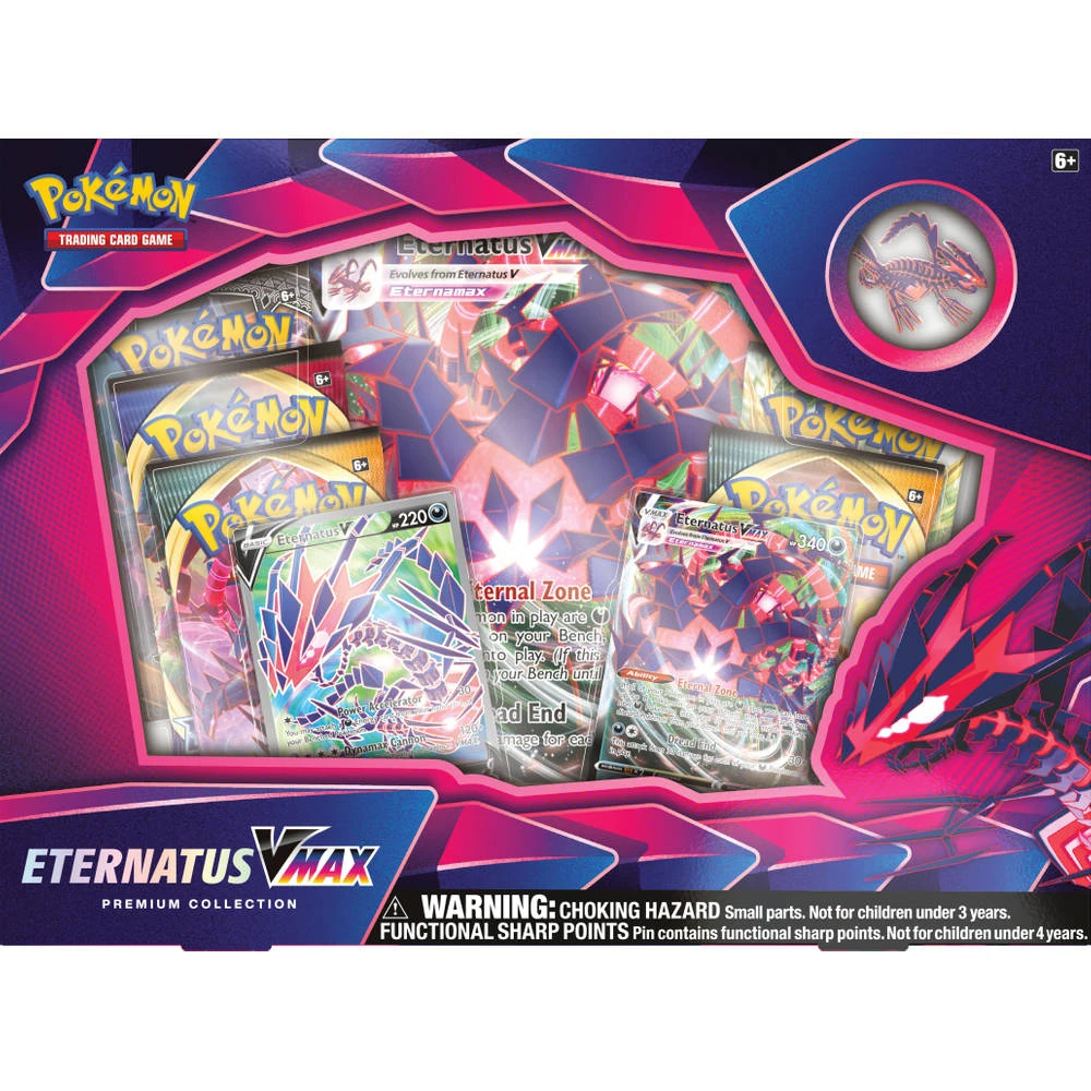 - Deze Eternatus VMAX Premium Collection box van Pokémon TCG bevat 1 Eternatus V foil promokaart, 1 Eternatus VMAX promokaart, 1 Oversized Eternatus VMAX promokaart, 5 boosterpacks, 1 collector’s pin en 1 codekaart voor de Pokémon Trading Card Game Online.