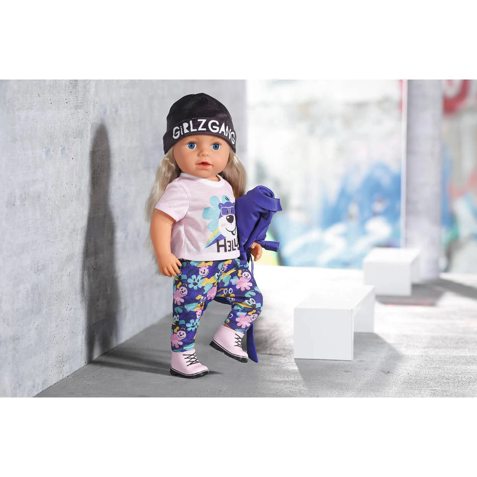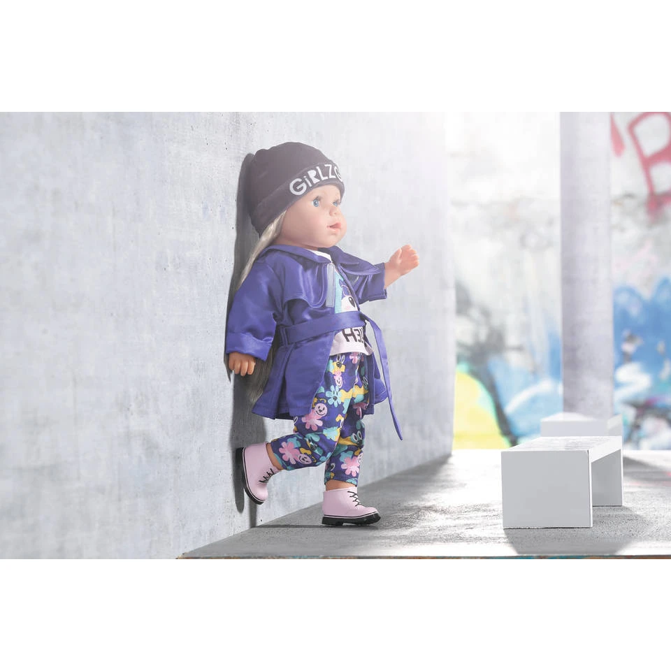 Laat met deze BABY born deluxe warmekledingset zien dat je pop stijl heeft. Deze supergave set is BABY borns modieuze antwoord op koude dagen. Ze combineert een roze t-shirt met stoere Bruno de beer print en contrasterende witte boord met een stijlvolle broek met print. Over de top draagt ze een trenchcoat in een extravagante paarsblauwe kleur. Haar roze laarzen en zwartfluwelen muts passen er perfect bij. Vandaag gaat ze de stad in met haar zus. Samen zijn ze net een echte ‘girl gang’.