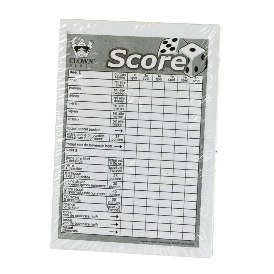 Met dit scoreblok van Clown Games kan je gemakkelijk de scores van een dobbelspel bijhouden. Het blok bevat 50 vellen.