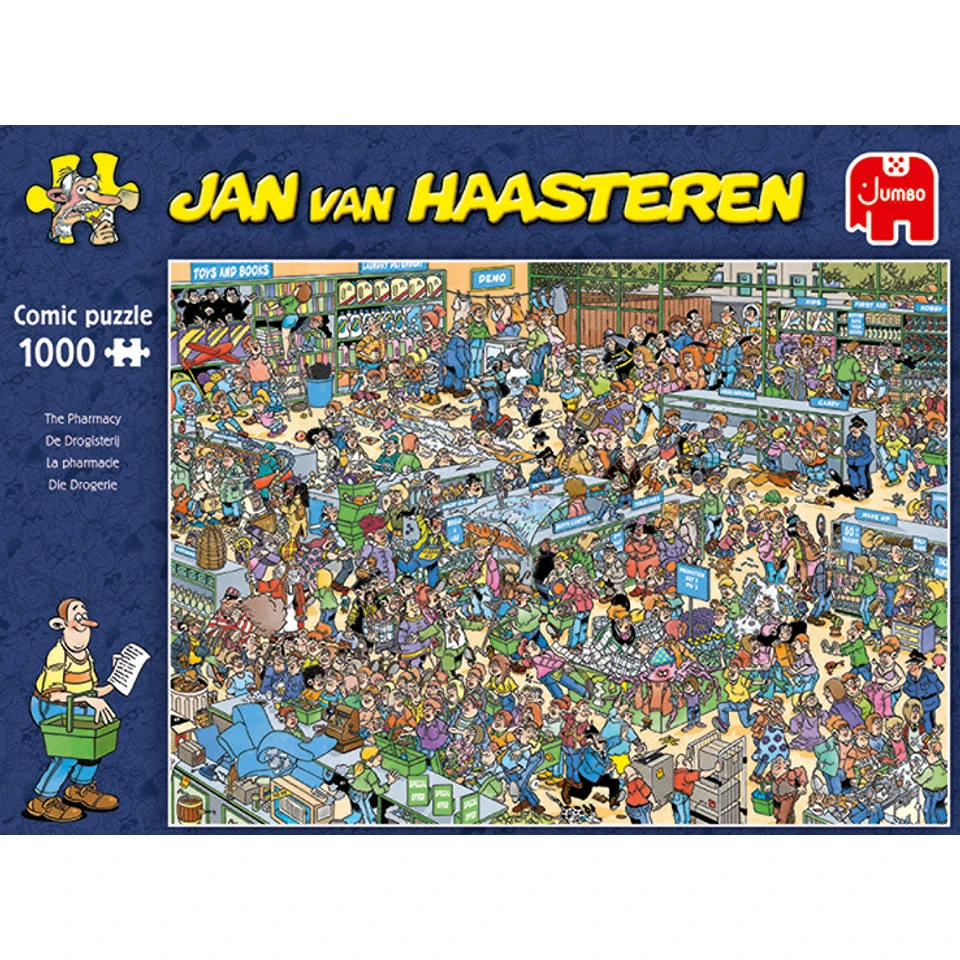 Ontdek met deze Jan van Haasteren puzzel een grappig plaatje van een hele drukke drogisterij! De puzzel bestaat uit 1000 stukjes.