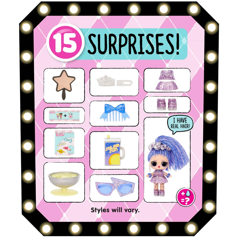 - Vijftien verrassingen inbegrepen waaronder een papieren spiegelaccessoire, een geheim bericht, een stickervel, een salonstoel, een kam, een beker, accessoires, mode, schoenen, L.O.L. Surprise! Hairgoals pop met echt haar.
