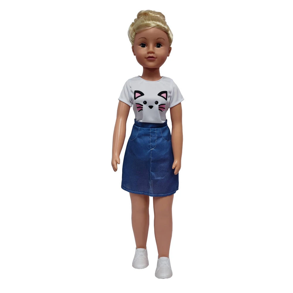 Je hebt dolle pret met deze pop met mooi, blond haar! De pop is 80 cm groot en kan echt lopen. Ze is gekleed in een stoere outfit.