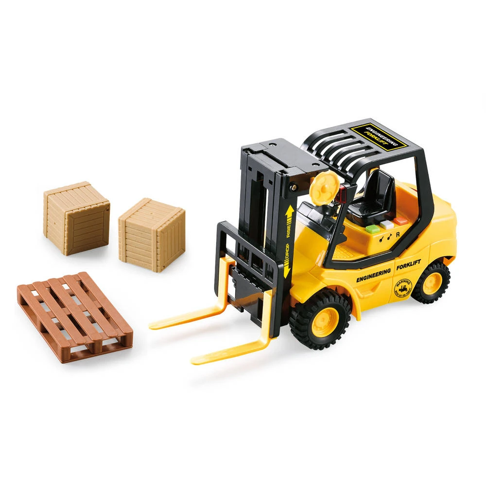 Op de bouwplaats is deze vorkheftruck onmisbaar. Dit voertuig is voorzien van licht en geluid en is gemaakt op een schaal van 1:16.