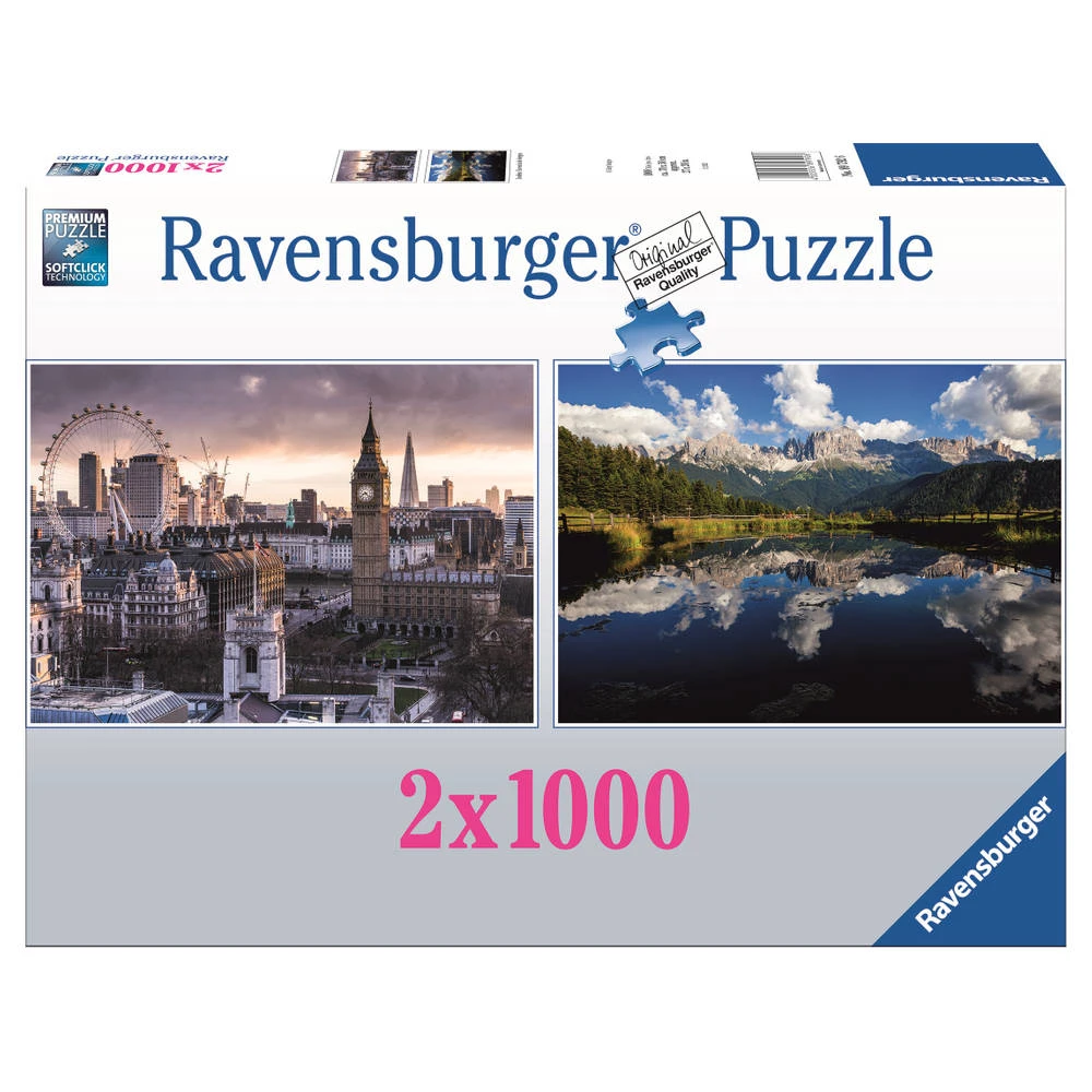 Aan deze Ravensburger Londen/Life in Mountains puzzelset beleef je dubbel puzzelplezier. In de doos zitten twee puzzels van elk 1000 stukjes.